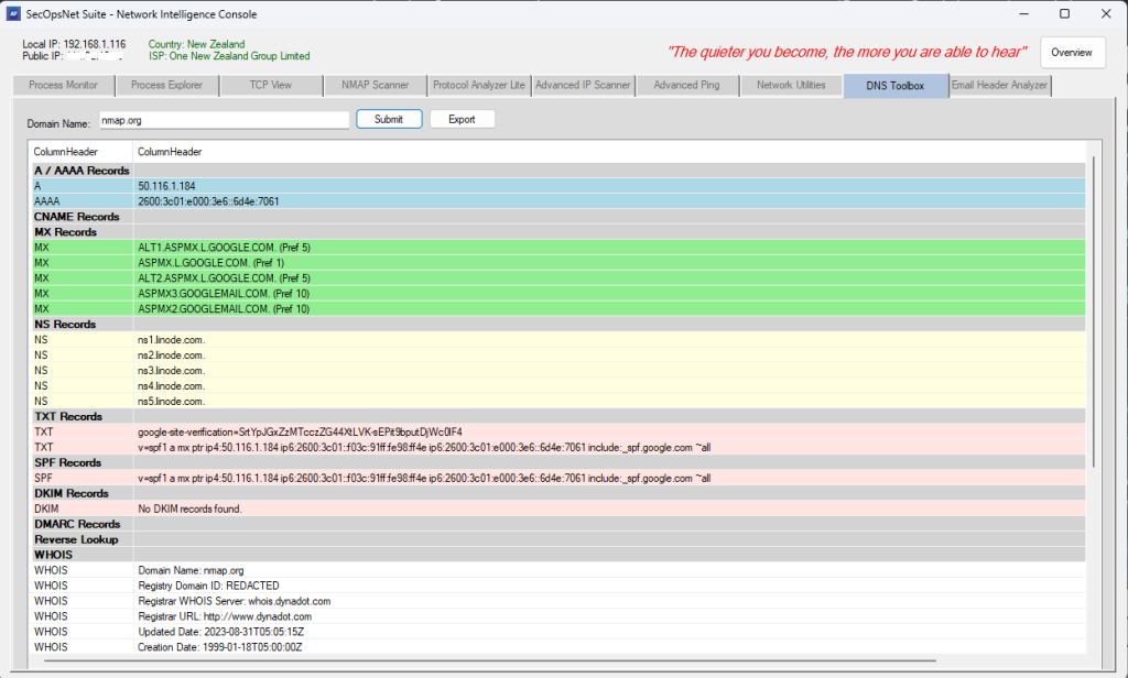 - Full DNS record queries via NSLookup