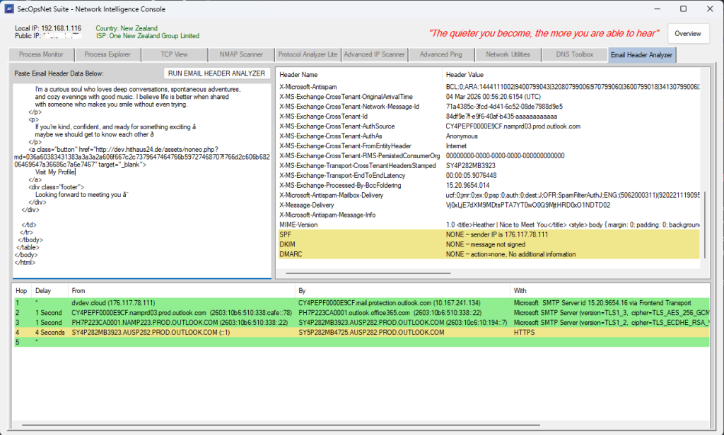 - Parses full email headers to reveal hop‑by‑hop routing paths