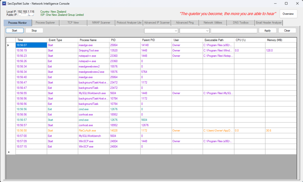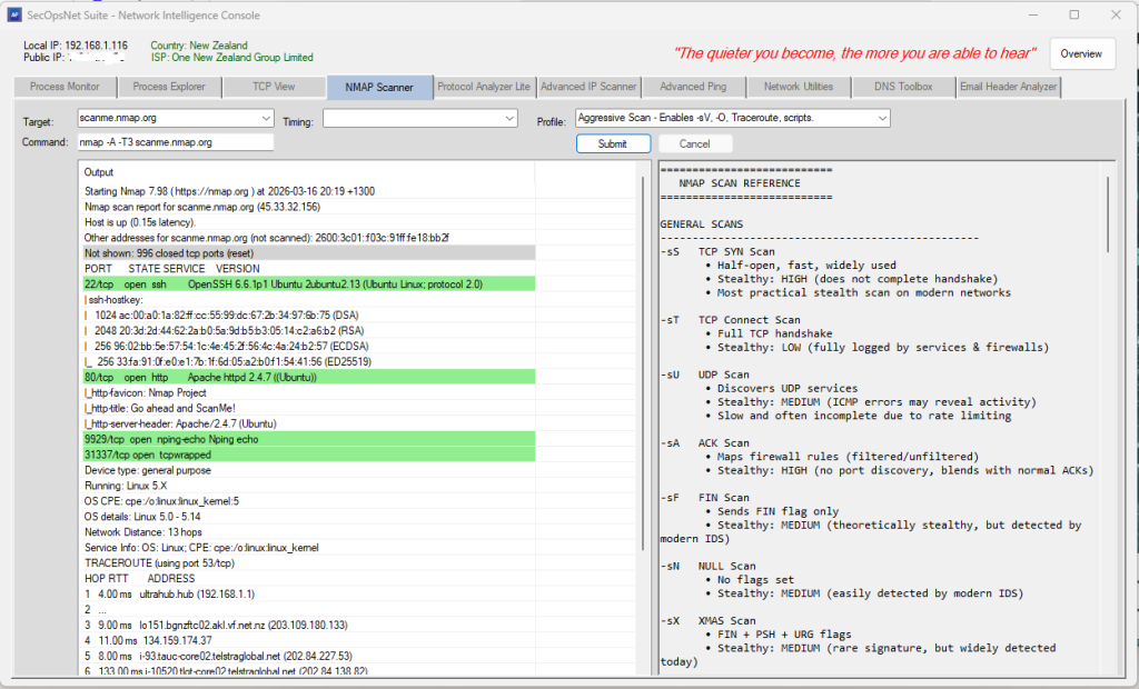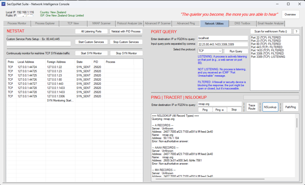 The Network Intelligence Console module provides a comprehensive suite of diagnostic, monitoring, scanning, and analysis utilities designed for network engineers, security analysts, administrators, and troubleshooting workflows. It centralizes deep inspection tools into a single interface for visibility, auditing, and investigation.