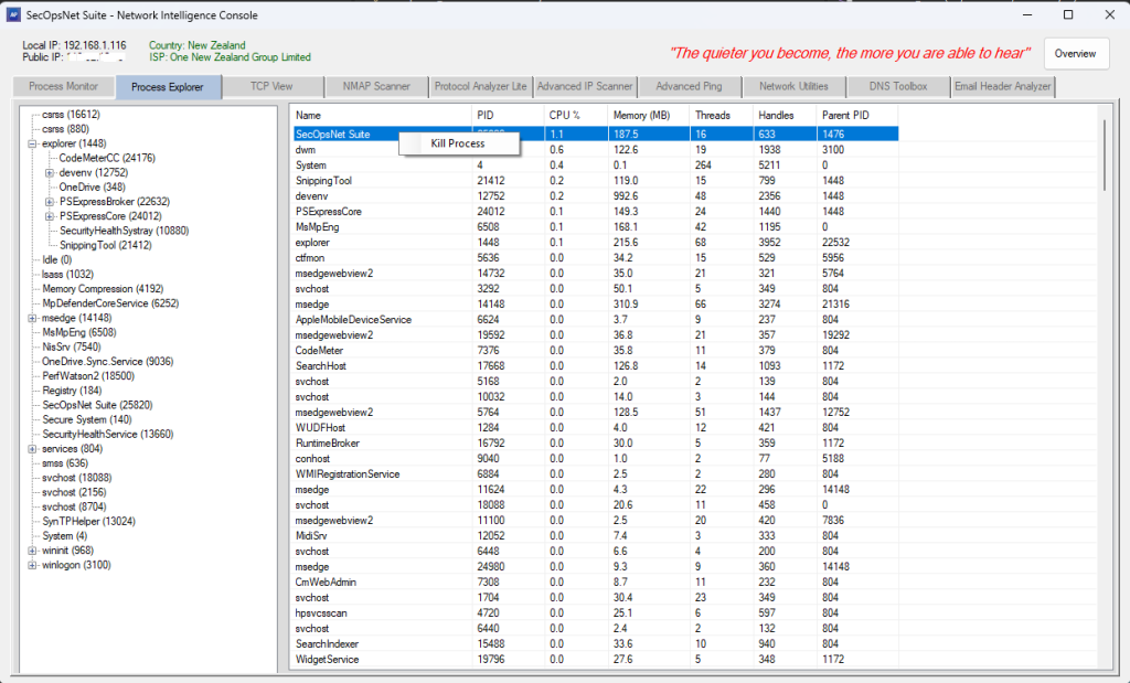 - Deep inspection of selected processes (modules, handles, threads, environment)