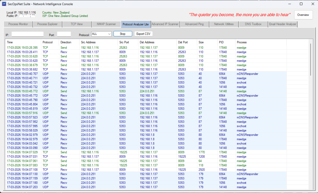 - Shows timestamp, direction, source/destination IP and port, size, PID, process