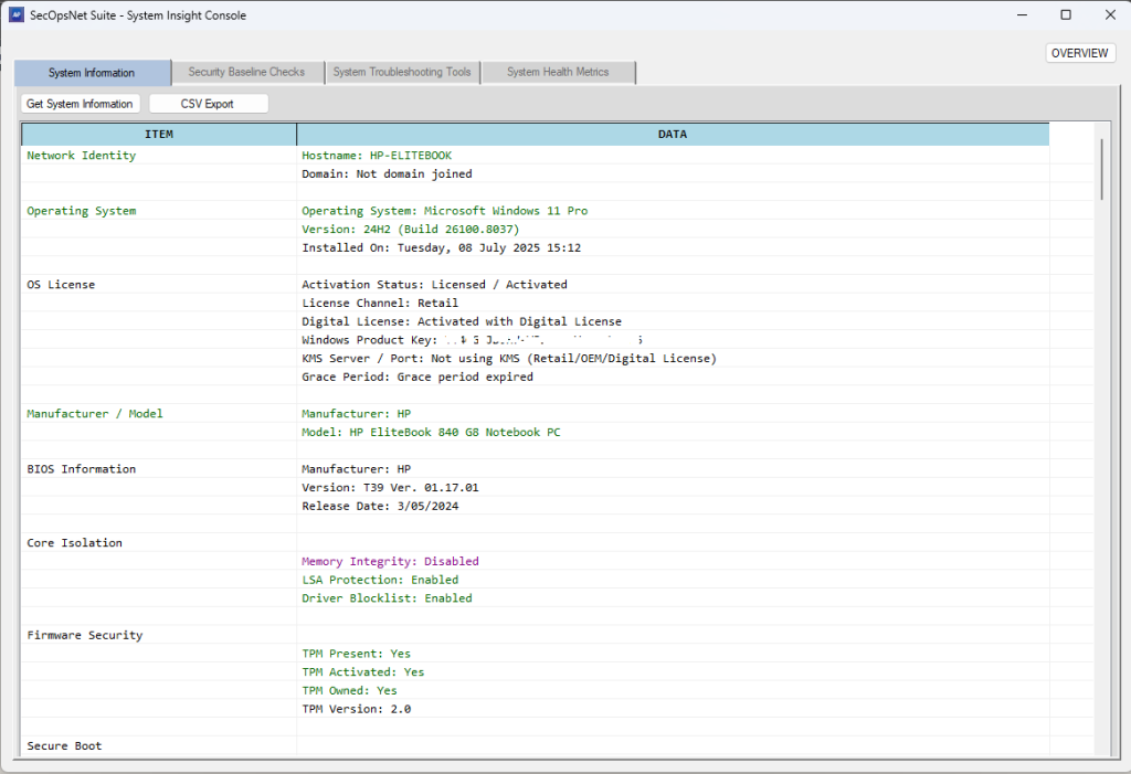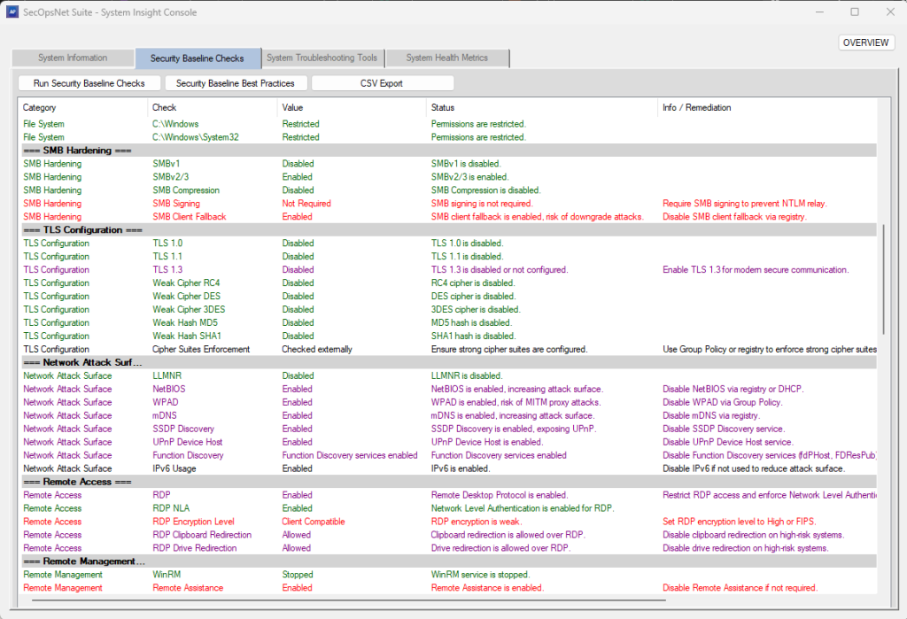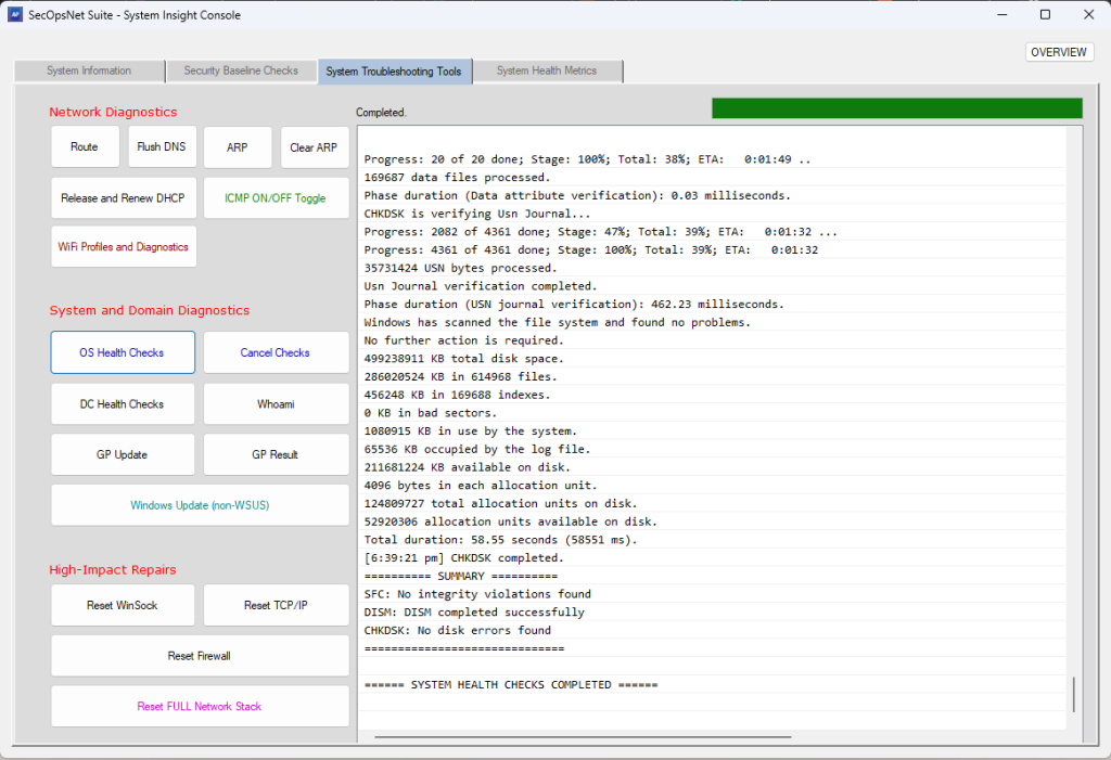 At the core of our platform is the SecOpsNet Suite, a unified console that combines system diagnostics, security baseline assessments, troubleshooting tools, and real-time health metrics – all in one interactive interface.