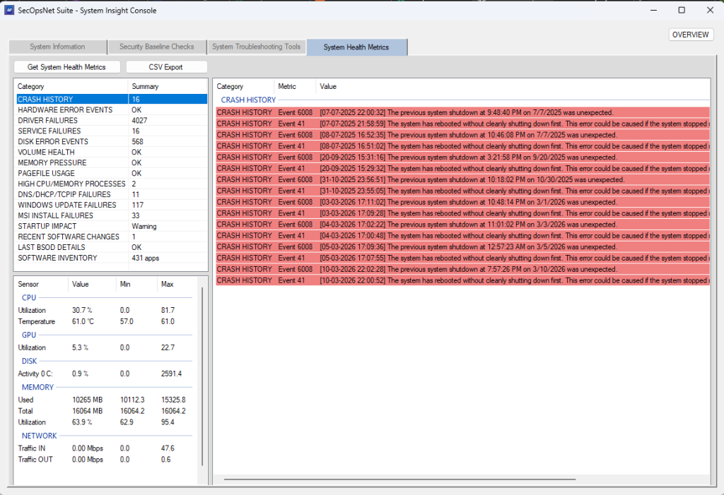- Crash history, driver/service failures, pagefile usage