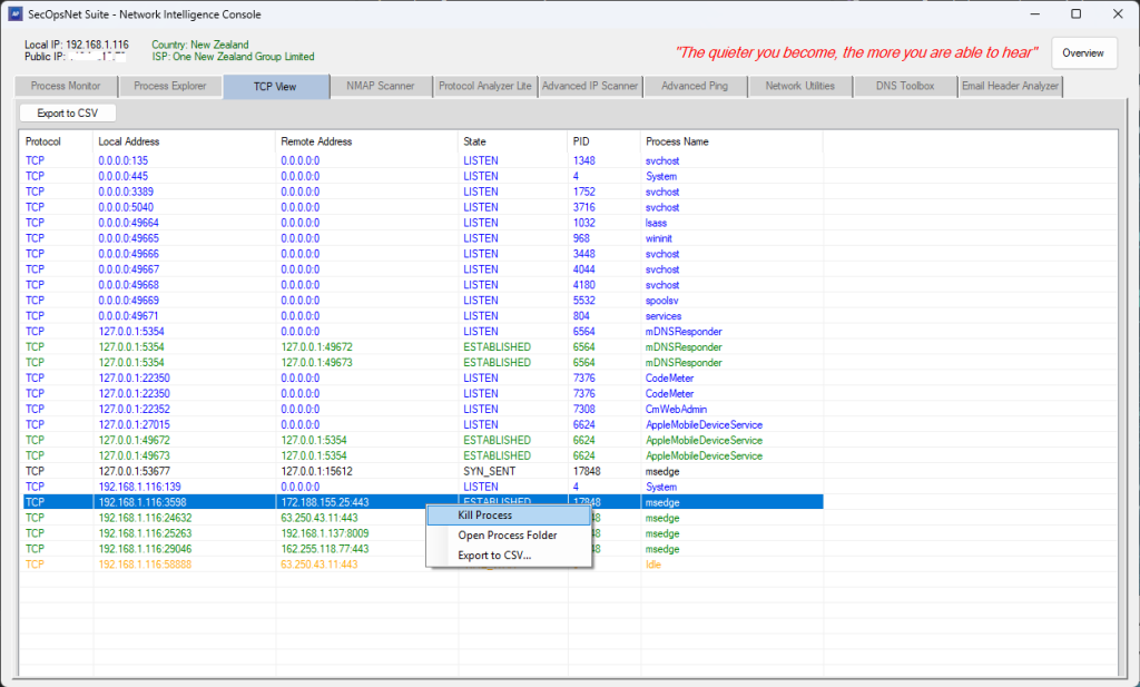 - Shows local/remote IP, port, protocol, and connection state