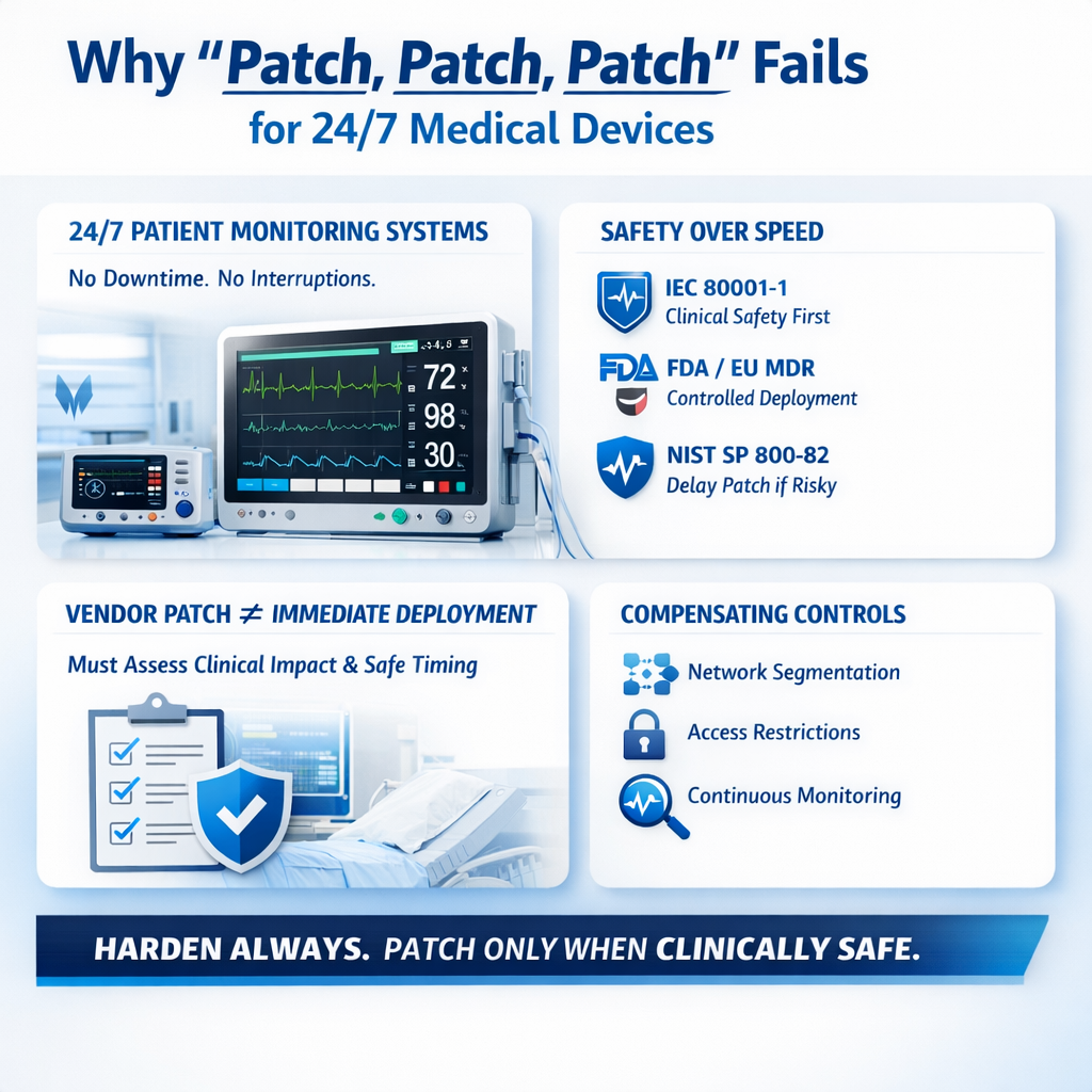 For these systems, clinical risk outweighs patch speed. Best‑practice frameworks across IEC, FDA, EU MDR, and NIST all agree: